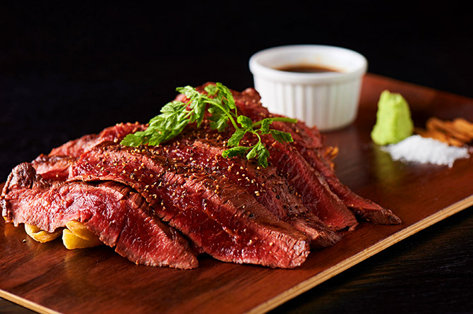 赤ワインベースの特製ソースや塩、わさびなど、お好みの薬味を付けてお楽しみください!