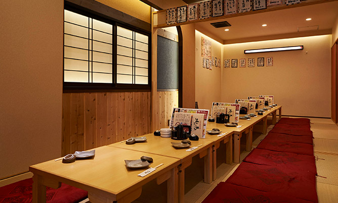 お席はカウンターとテーブルの他、仕切りを調節して最大18名様で貸し切りにできる座敷をご用意。