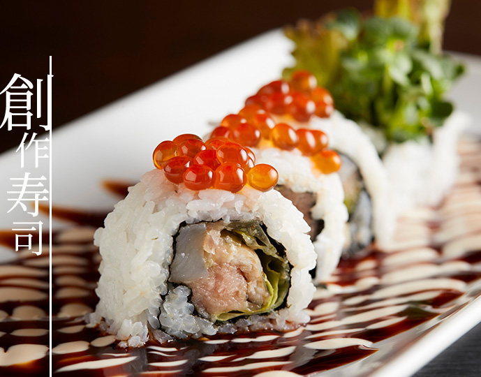 当店人気の逸品は、ネギトロ・ホタテ・白身・穴子などを盛り込んだ創作ロールです。