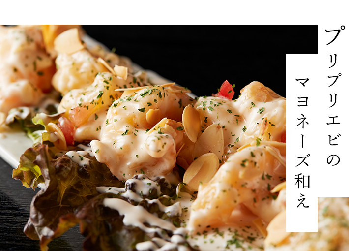 新鮮なエビに、マヨネーズと牛乳、蜂蜜で作る自家製のマヨネーズソースを絡めた逸品。